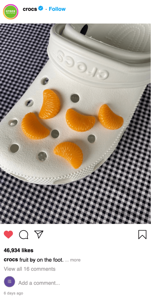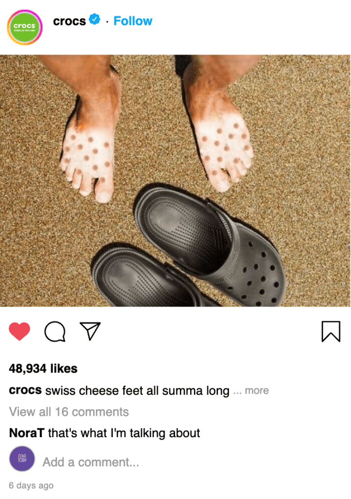Insight: Crocs are great at meme-ifying their shoes to increase sales. It instantly engages Gen-Z/Millennial audiences.